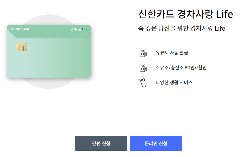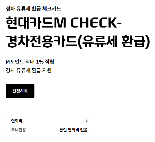 이제 환급 대상인 걸 확인했으면 어디서 신청하느냐가 문제겠죠? 바로 롯데, 신한, 현대 카드사에서 발급하는 경차 유류세 환급카드를 사용하면 돼요. 전월 실적 조건도 크게 없고, 연회비는 당연히 무료!