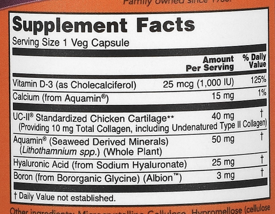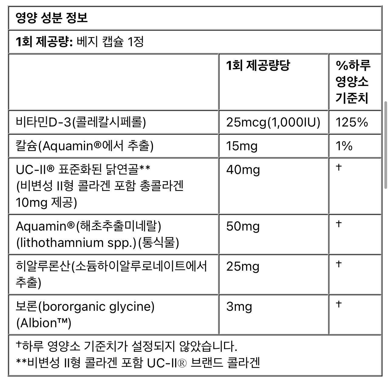 이 영양제는 관절 건강과 가동력을 지원하는 비변성 II형 콜라겐이 함유된 특허 제형 콜라겐인 UC-II®를 주성분으로 하고 있습니다.
