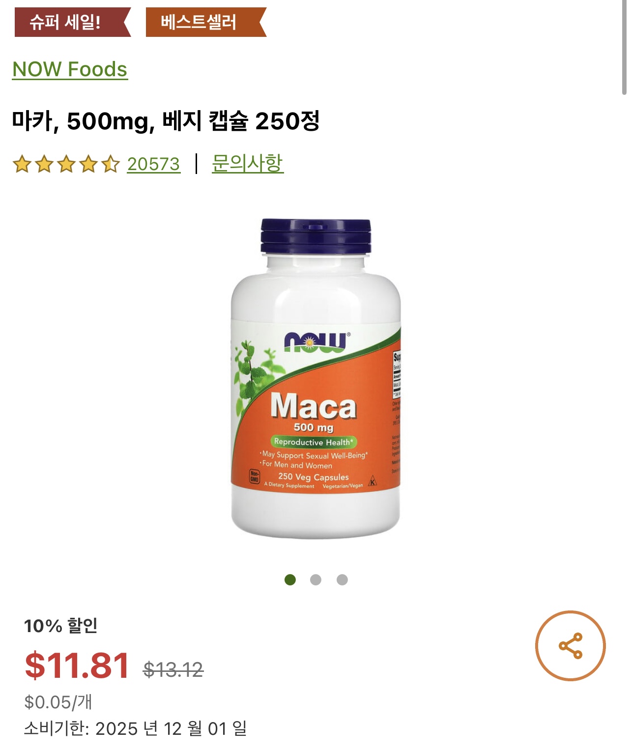 나우푸드 마카: 페루의 산삼으로 불리는 마카 뿌리를 원료로 한 건강식품입니다. 마카는 성기능 개선, 생식력 증진, 운동 성능 향상 등의 효능이 있습니다 .