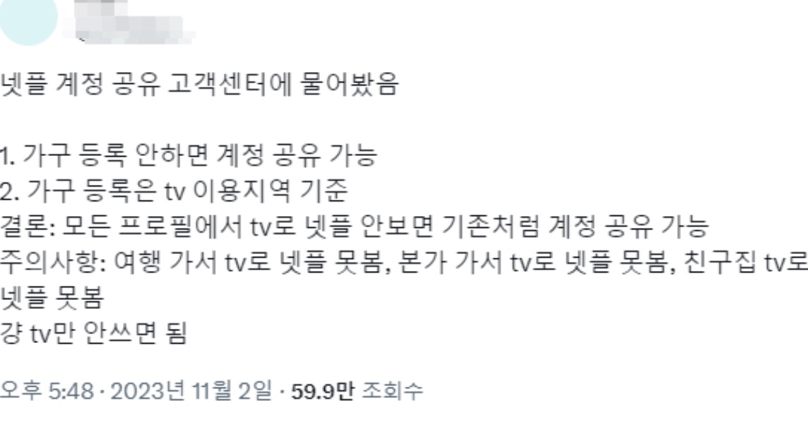 하지만, 이용가구를 설정하지 않으면, 넷플릭스는 접속된 기기의 IP주소 또는 디바이스 ID, 계정 주인의 활동을 분석해서 추가 회원을 단속할 수 있다고 합니다. 따라서, 가능하면 이용가구를 설정하는 것이 안전하고 편리합니다. 이용가구를 설정하면, 넷플릭스 계정 공유 금지 정책에 걸리지 않고, 넷플릭스 콘텐츠를 다양한 기기에서 즐길 수 있습니다.