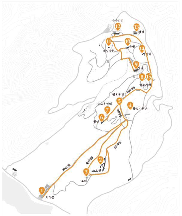 - 별유동천: 200년이 넘은 배롱나무를 조경가 카와기시 마츠노부가 정성스레 옮겨심은 곳입니다.