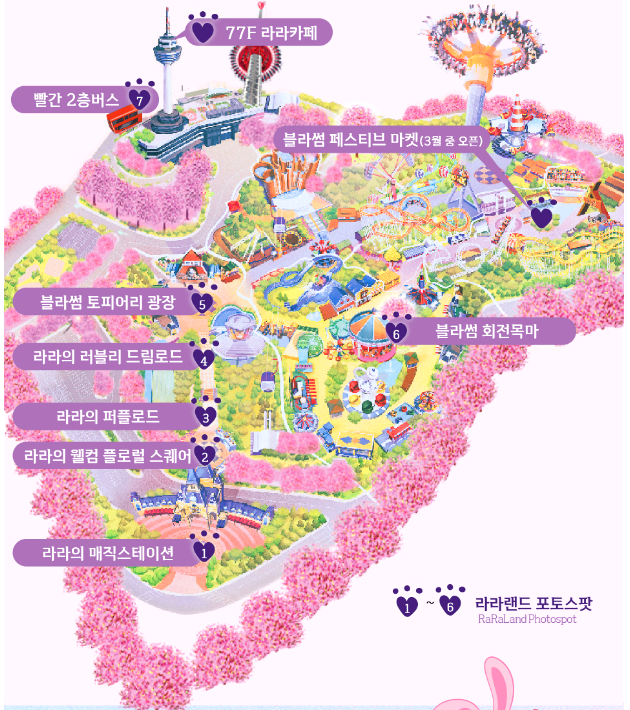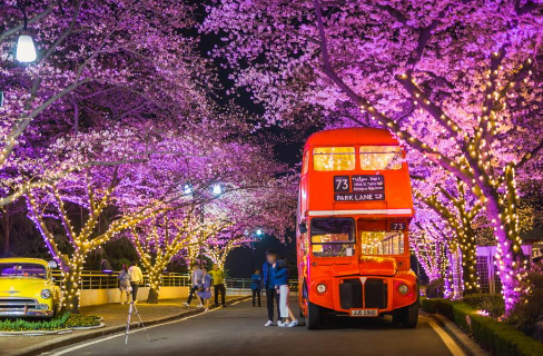 야간에도 블라썸 피크닉을 즐길 수 있다는 게 이월드 벚꽃축제의 매력 포인트라고 할 수 있습니다. 밤이 되면 레인보우 라이팅과 함께 또 다른 모습으로 물든 벚꽃을 감상하실 수 있거든요! 퍼플 포토존, 회전목마, 빨간 2층버스 등 인생샷 건질 명소들도 놓치지 마세요.
