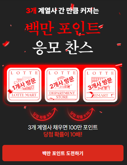 마지막으로 소개해 드릴 혜택은 백만 포인트 미션인데요. 롯데 레드 페스티벌 참여 매장에서 5월 30일부터 6월 9일까지 3번 이상 구매하면 추첨을 통해 100만 포인트를 드린대요. 엘포인트 적립 가맹점이라면 어디에서 사도 인정된다고 하니 평소처럼 쇼핑하시면서 스탬프 모으시면 될 것 같아요.