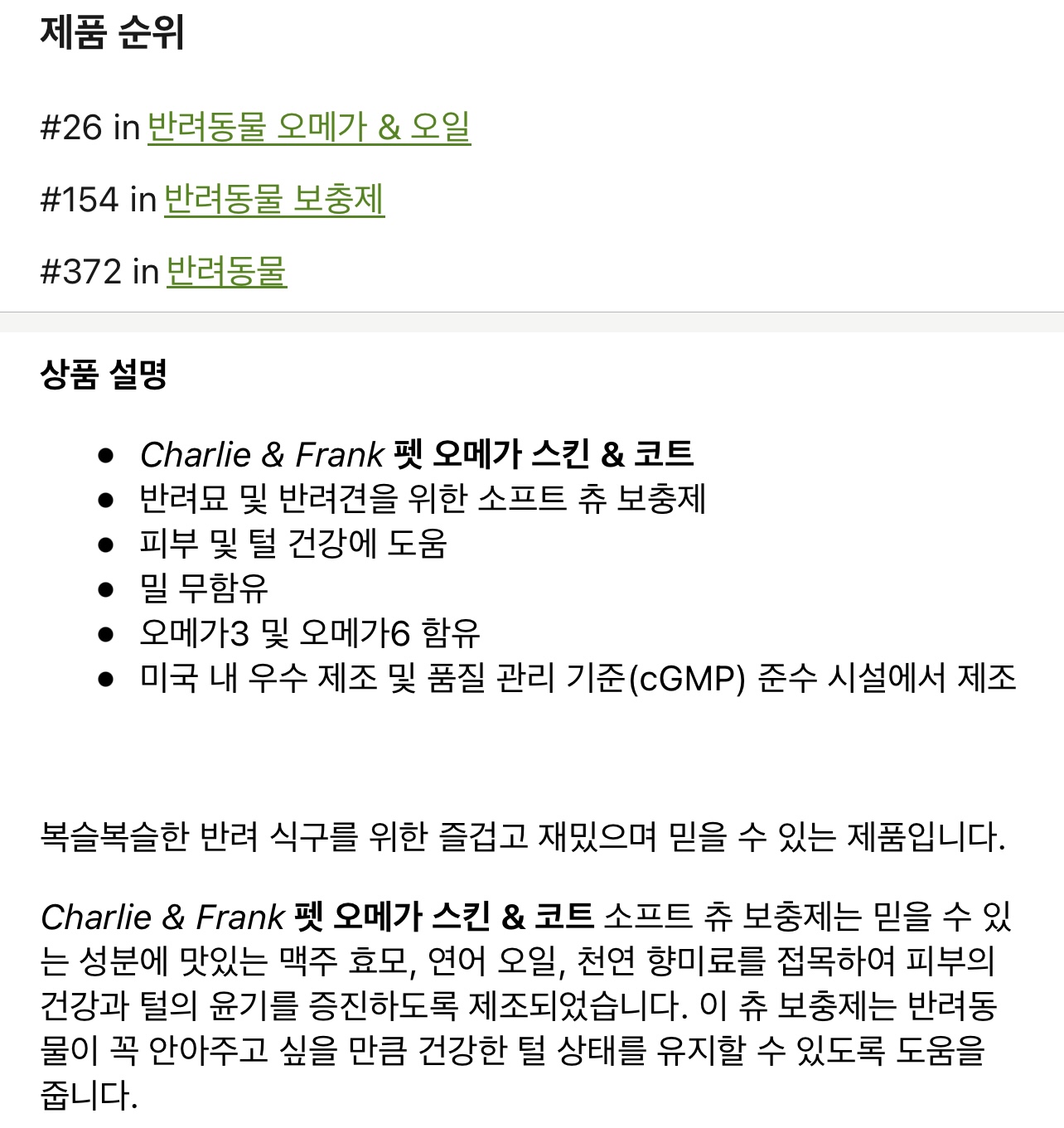 이 제품은 반려동물의 면역력, 모질개선, 알러지개선에 도움을 주는 오메가3 보충제로, 맛있는 츄 형태로 제공되어 반려동물이 쉽게 섭취할 수 있습니다.
