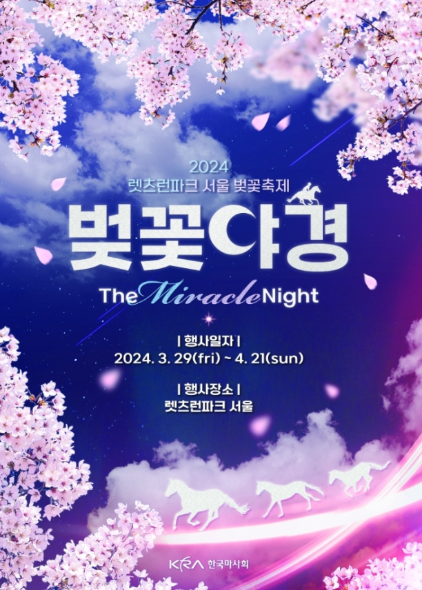 렛츠런파크 서울은 경마공원으로 유명하지만, 매년 봄이 되면 아름다운 벚꽃으로 뒤덮입니다. 올해는 '벚꽃야경'이라는 이름으로 특별한 벚꽃축제를 개최한다고 하는데요. 벚꽃과 야경, 그리고 야간경마가 어우러진 이색적인 축제가 될 것 같아요.
