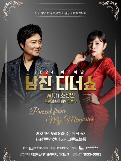 레전드 가수 남진과 정열적인 가수 조정민의 합동 공연인 이번 디너쇼 콘서트는 2024년 5월 8일 수요일 저녁 6시, 63컨벤션센터 2층 그랜드볼룸에서 약 150분간 진행됩니다.