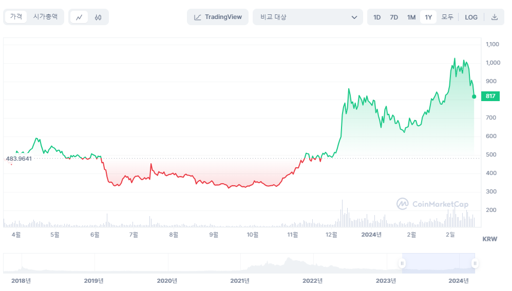 차트에는 몇 가지 주요 매물대가 있는데요. 대표적으로 20일 이동평균선, 볼린저밴드 하단, 그리고 2021년 쌍봉 매물대 부근이 있습니다. 이 중 2021년 쌍봉 저점인 1000원 부근이 앞으로의 바닥 매수 타점이 될 수 있겠네요.
