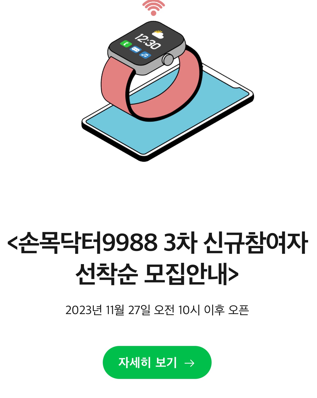 손목닥터 9988은 선착순으로 마감되므로 모집 시작일에 최대한 빨리 신청하시길 바랍니다. 아래를 버튼을 클릭하셔서 바로 신청이 가능합니다.