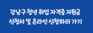 강남구에서는 강남구여성 일자리 능력센터의 수강생 중 국가공인 자격증 취득자에게 응시료를 지원해줍니다. 지원 범위는 분기별 1회, 자격증 1개에 한해 최대 1만 원입니다. 지원 조건은 강남구 일자리 청년센터의 교육과정 수료 후 1년 이내 동일 계열의 국가공인 자격증을 취득하고, 자격증 발급일 이후 3개월 이내 신청한 자입니다.