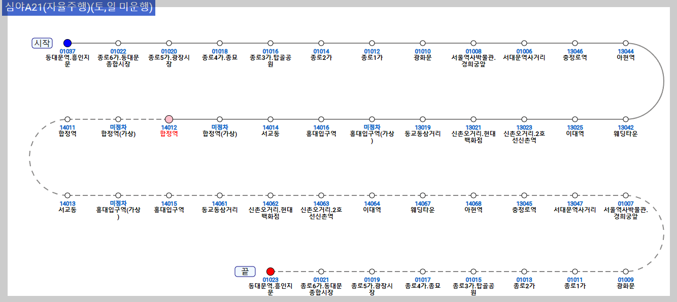 이 버스는 오후 11시 30분부터 오전 5시 10분까지 합정역에서 출발하여 홍대입구역, 이대역, 광화문, 종로5가 등을 거쳐 동대문역까지 총 9.8㎞ 구간을 운행합니다.