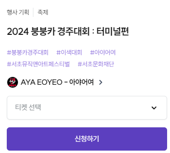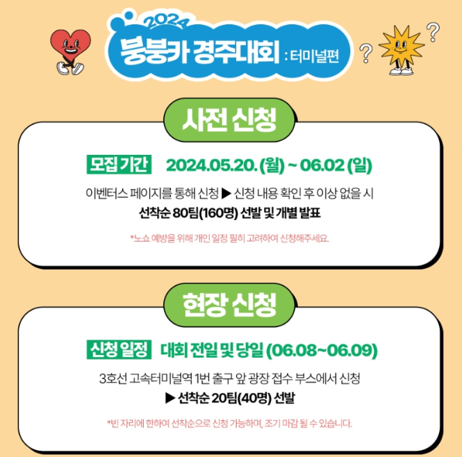 | 2024년 6월 9일 | 15:00~17:00 | 서울고속버스터미널 광장 | 2인 1팀, 선착순 80팀 |