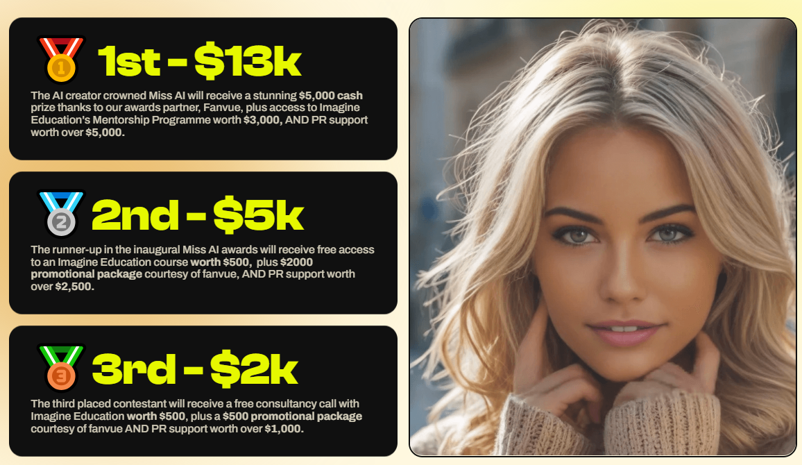 미스 AI는 미국의 크리에이터 플랫폼 '팬뷰(Fanvue)'가 주최하는 대회로, 100% AI 기술로 만들어진 캐릭터만 참가할 수 있습니다. 총상금 규모는 20만 달러(약 2억 7,700만 원)에 달하며, 1등에게는 현금과 멘토십 프로그램, PR 지원 등 총 1만 3,000달러(약 1,800만 원) 상당의 혜택이 주어집니다.