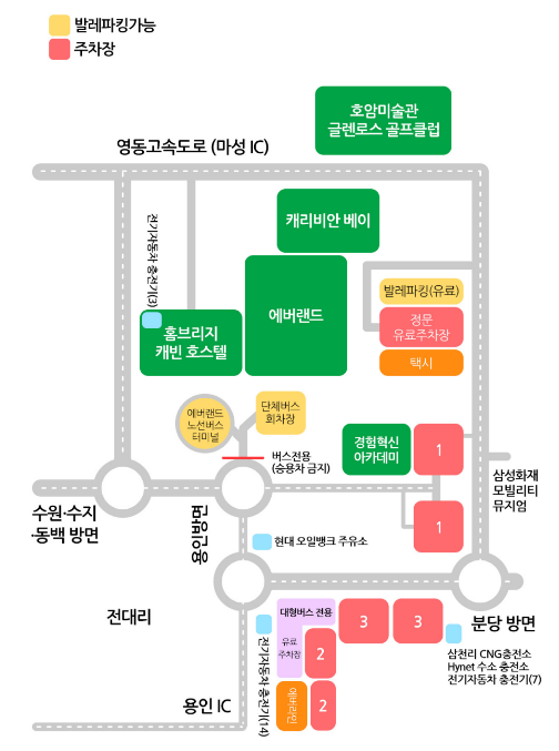 에버랜드와 거리가 조금 떨어져 있으나, 무료 셔틀버스 이용이 가능합니다. 주차장1, 2, 3이 있으며, 평일에는 주로 주차장 1을 사용합니다.