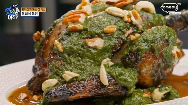 유럽식 통닭 | 간장, 발사믹 소스, 바질페스토, 견과류 토핑 | 소스에 찍어 먹거나 등껍질을 고기와 찹쌀밥에 싸서 먹기 |