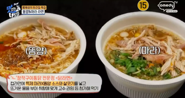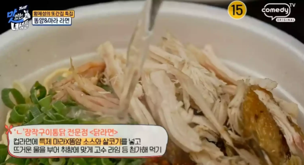 '남영탉'의 또 다른 인기 메뉴는 바로 마라&똠양 닭라면이에요. 사실 황제성은 이 라면을 먹기 위해 이 가게를 찾는다고 고백해서 모두를 놀라게 했대요.