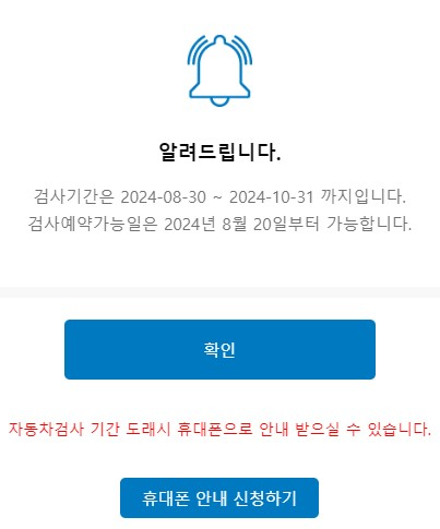 자동차 정기검사 기간을 잊어버리는 경우가 많습니다. 그래서 미리 예약해두면, 자동으로 검사날짜 알림이 오는 서비스를 신청할 수 있습니다.