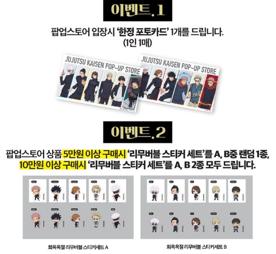 주술회전 팝업스토어에서는 팬들을 위한 다양한 이벤트와 혜택이 준비되어 있습니다. 스토어에 입장하시는 분들께는 한정 포토카드를 1인 1매씩 드리고 있어요. 또한, 상품 구매 금액에 따라 특별한 선물도 받을 수 있답니다.