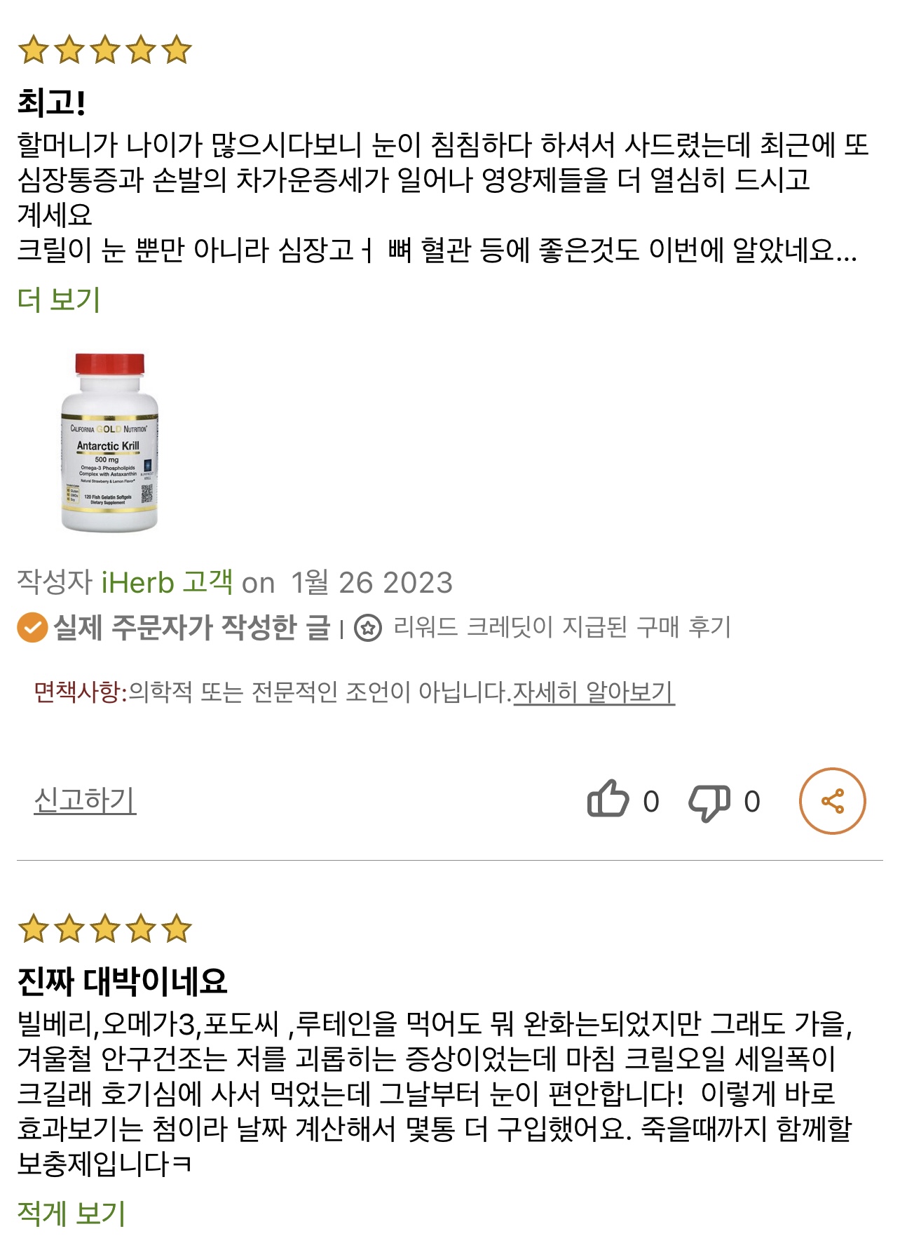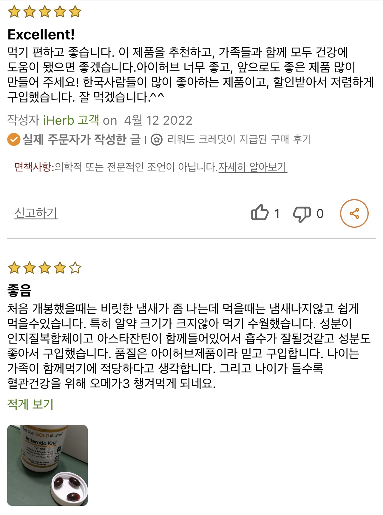 첫째, 캘리포니아 남극 크릴오일 오메가-3는 천연 딸기향, 작은크기,  소프트젤로 제공되어 복용이 편리하고 쾌적합니다.