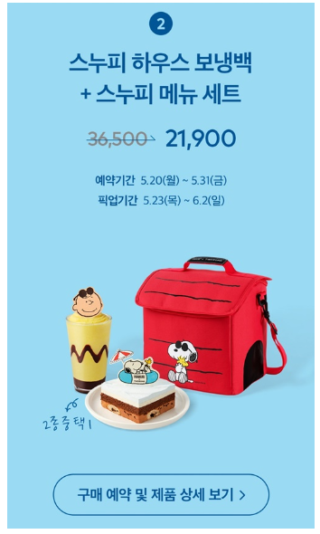 | 스누피 하우스 보냉백 | 스누피 메뉴 세트 (2가지 중 택 1) | 21,900원 (단품가 30,000원) | 2024.05.20 - 2024.05.31 | 2024.05.23 - 2024.06.02 |
