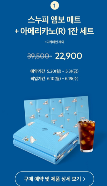 | 스누피 엠보 매트 | 아메리카노(R) 1잔 세트 | 22,900원 (단품가 35,000원) | 2024.05.20 - 2024.05.31 | 2024.06.10 - 2024.06.19 |