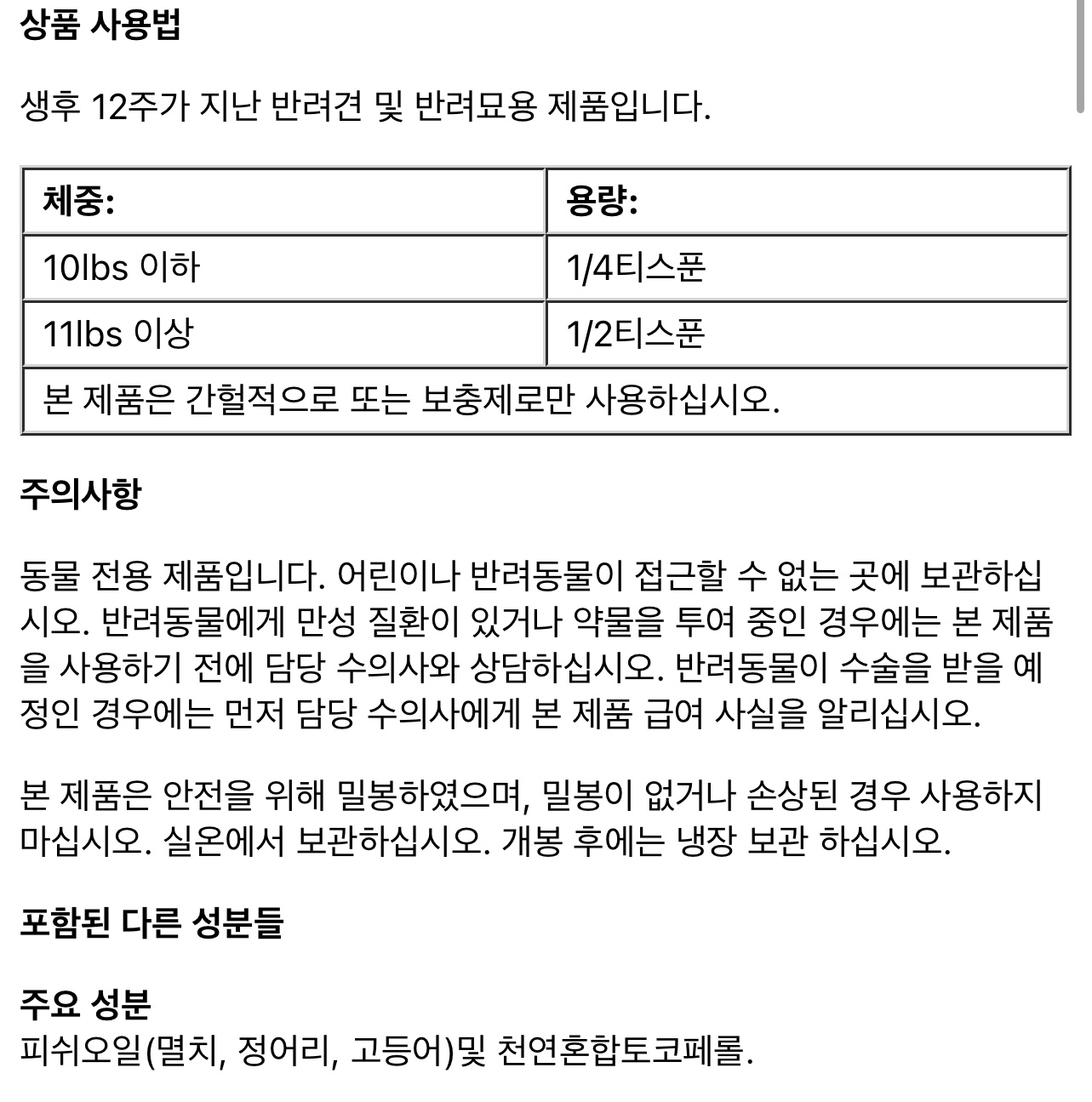 애완동물의 심장, 관절, 피부, 모질 건강을 개선하고 뇌 건강을 증진하는 데 도움이 되는 이 제품을 활용하여 반려동물의 건강을 챙겨보세요.