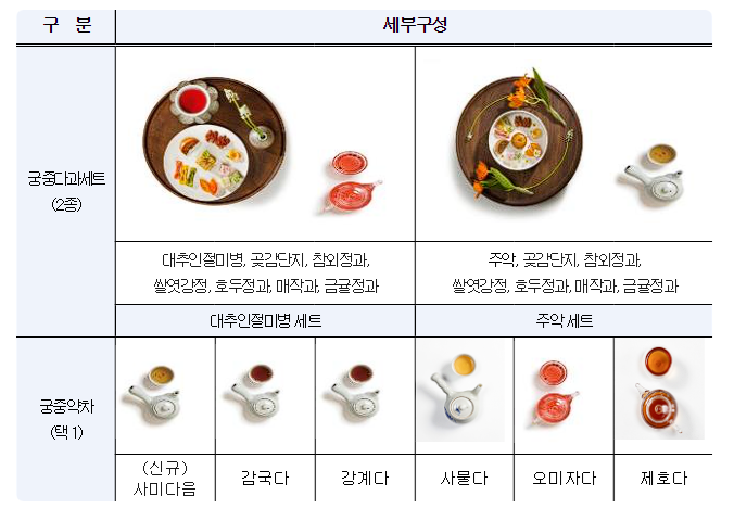 | 주악 세트 | 주악, 곶감단지, 참외정과, 쌀엿강정, 호두정과, 매작과, 금귤정과 + 약차 1종 |