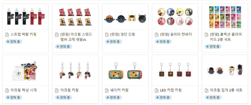 | LED 키링, 아크릴 키링, 글리터 캔배지 등 | 1~3만원대 |