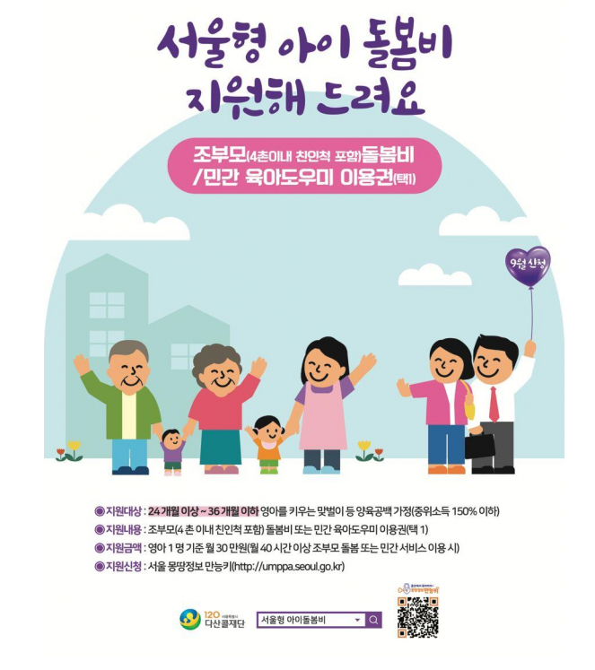 아이를 돌보는 것은 부모의 책임이지만, 맞벌이, 한부모, 다자녀 가정 등 부모가 직접 아이를 돌보기 힘든 경우가 많습니다. 이런 가정들을 위해 서울시가 마련한 '서울형 아이돌봄비’는 조부모나 삼촌, 이모 등 4촌이내 친인척이나 민간 육아도우미의 돌봄지원을 받는 가정에 돌봄비용을 지원하는 사업입니다.