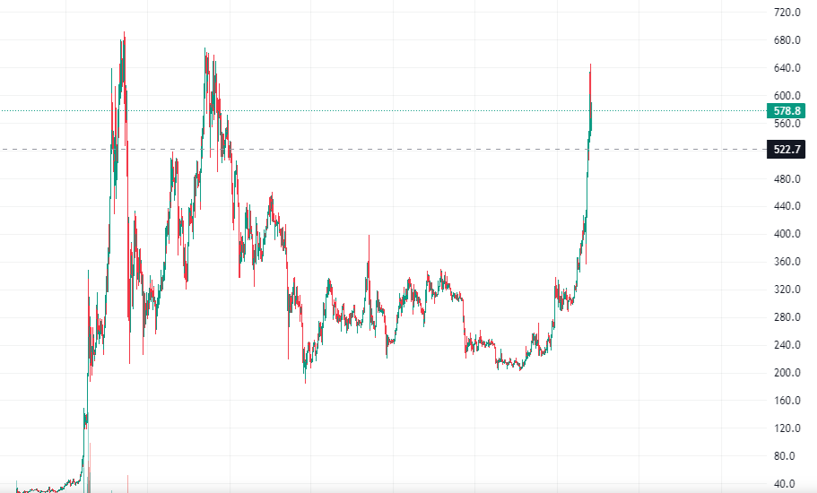먼저 BNB 코인의 최근 가격 추이를 보면 상당히 고무적입니다. 불과 1년 전만 해도 200달러 선에서 거래되던 BNB는 최근 600달러 선까지 치솟으며 3배 가까이 상승했습니다.