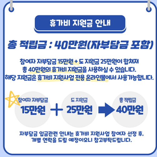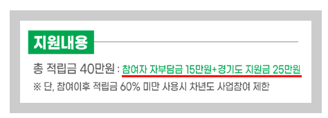 자, 그럼 궁금하시죠? 얼마나 받을 수 있는지! 총 40만 원의 적립금을 받을 수 있어요. 여기에는 여러분이 자부담하는 15만 원과 경기도에서 지원하는 25만 원이 포함되어 있어요.