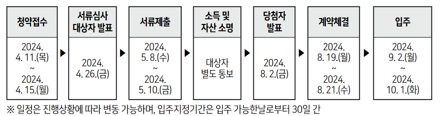 4월 11일부터 15일 오후 5시까지 온라인으로 신청접수를 받습니다. 1인 1주택만 신청할 수 있고, 인증서 로그인 후 주소지 단위로 신청하면 됩니다. 동호수는 추첨을 통해 배정됩니다. 주말에는 청약신청을 할 수 없으니 평일 시간을 잘 활용하시기 바랍니다.