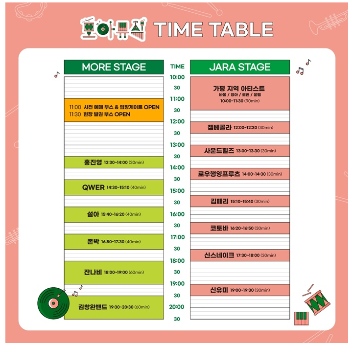 경기모아뮤직페스티벌에서는 2개의 무대가 운영됩니다. 'MORE STAGE'와 'JARA STAGE'인데요. 각 무대별 주요 공연 일정을 확인해 보세요.