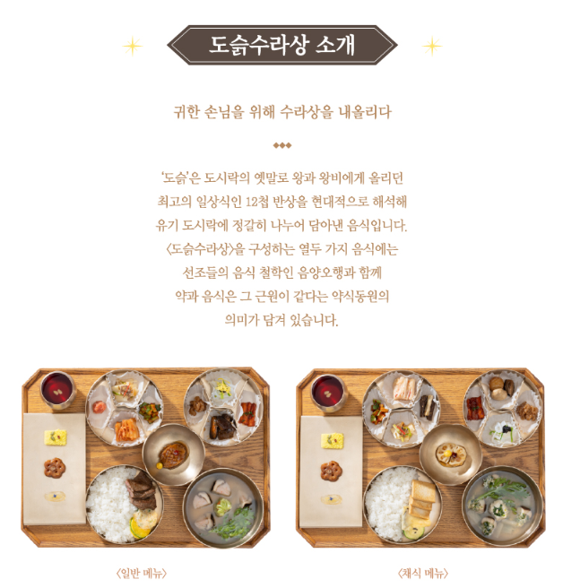 경복궁 별빛야행에 참여하면 소주방에서 국악 공연을 감상하며 왕과 왕비가 받았던 12첩 반상, 도슭수라상을 맛볼 수 있습니다. 도슭수라상은 현대적으로 재해석되어 유기 도시락에 담겨 제공되는데요, 홍시죽순채, 죽순, 배추김치, 새우젓, 삼합장과, 소고기, 홍합, 표고버섯 등 다양한 음식을 맛볼 수 있습니다.