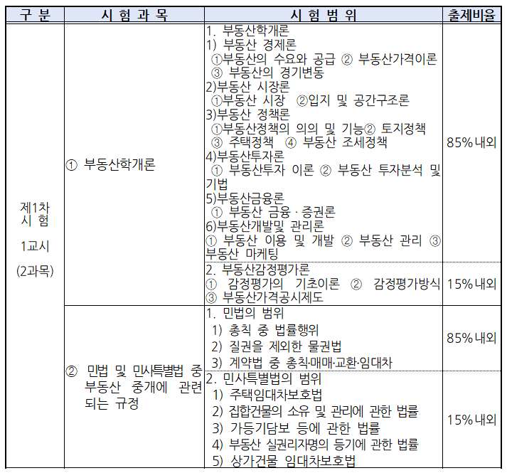 | 1차 1교시 | 부동산학개론 (40문항) 민법 및 민사특별법 (40문항) |