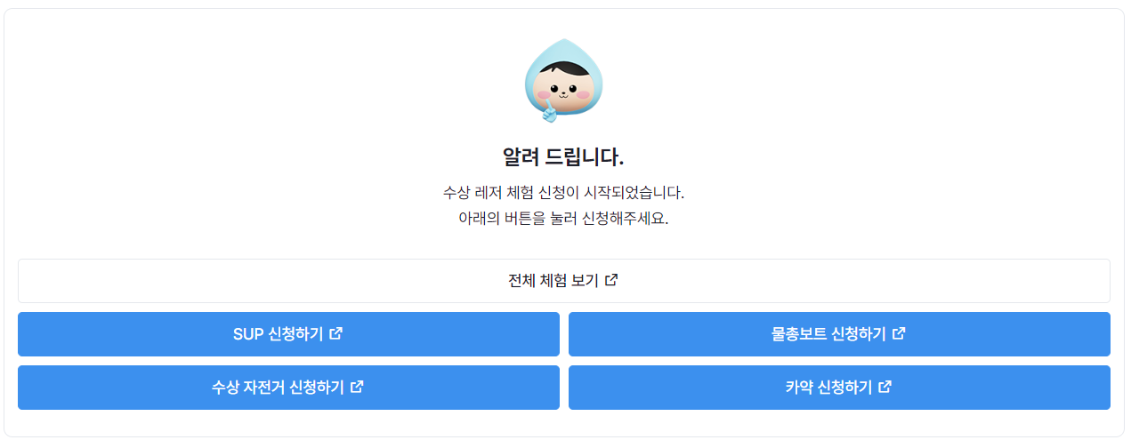 체험종목 | SUP체험(1인승): 5,000원 카약체험(2인승): 10,000원 수상자전거(2인승): 10,000원 물총보트(2인승): 10,000원 |