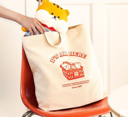 미니 사이즈(3,000원)와 대형 사이즈(5,000원) 두 가지로, 가볍고 튼튼한 소재로 제작되었어요. 특히 대형 에코백은 6월 2주에 입고되니 집 근처 다이소 매장 재고를 꼭 확인하고 구매하시는걸 추천 드려요.