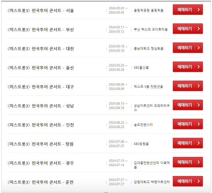 미스트롯3 전국투어 콘서트는 5월 3일 서울 공연을 시작으로 7월 27일 춘천까지 이어집니다. 총 3개월에 걸쳐 전국 주요 도시에서 공연이 개최되니 여러분이 계신 지역의 공연 일정을 아래에서 꼭 확인해 보시기 바랍니다.