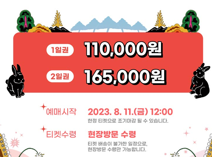 하지만 이런 꿈의 락 페스티벌에 참여하려면 먼저 티켓팅에 성공해야겠죠? 티켓은 1일권과 2일권으로 판매되며 각각 110,000원, 165,000원입니다.