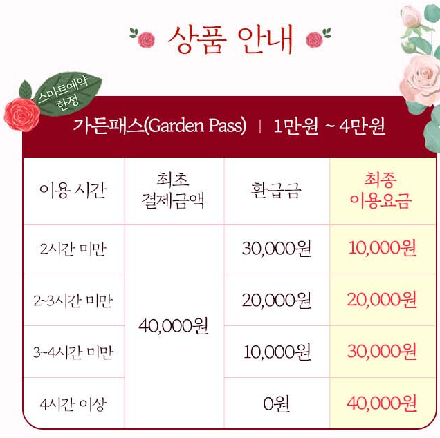 - 이용 요금: 10,000원부터 (최초 40,000원 결제 후 이용 시간에 따라 차등 환급)