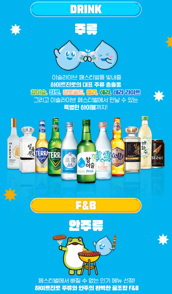 이슬라이브 페스티벌에서는 하이트진로의 대표 주류들을 만나볼 수 있어요. 이슬, 진로, 진로골드, 켈리, 테라, 테라 라이트 그리고 특별한 하이볼까지! 취향저격 술들이 여러분을 기다리고 있답니다.