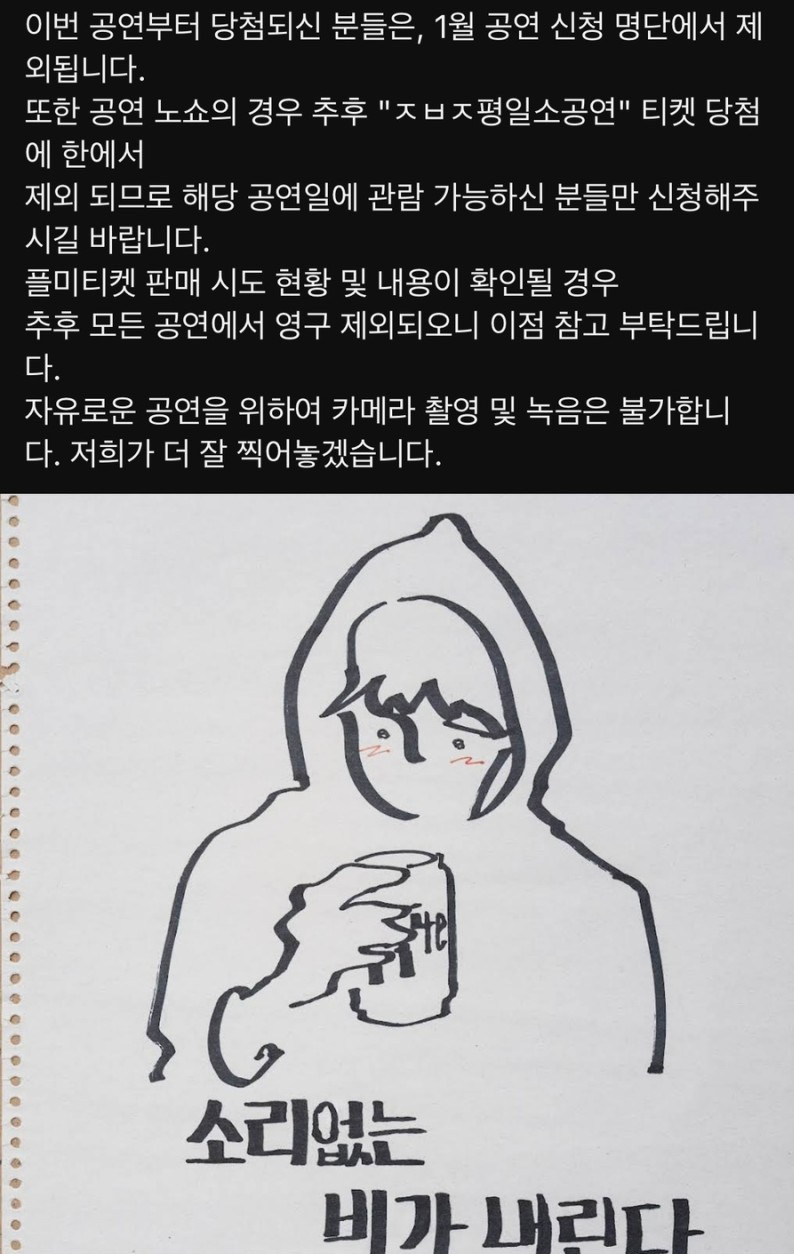 앞으로 주마다 2회 공연하는데 그 전주에 유투브 커뮤니티에 공지하는 시간에만 구글폼이 활성화되게 해서 신청서 작성 후 랜덤당첨된 사람만 공연 당일 가서 표 현장 구매 후 관람 가능하다는 것입니다.