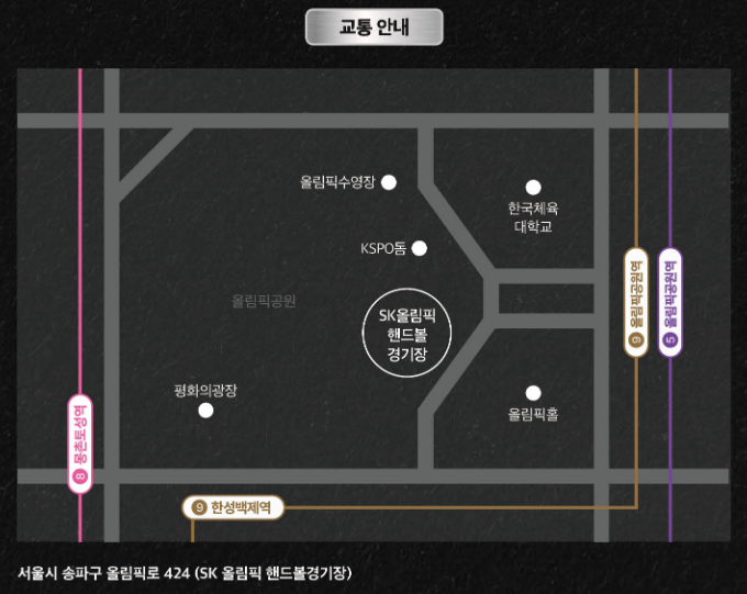 팬미팅이 열리는 SK올림픽핸드볼경기장은 서울특별시 송파구 올림픽로 424에 위치해 있습니다. 지하철 5호선 올림픽공원역 3번 출구로 나오시면 편리해요. 차량을 이용하신다면 올림픽공원 주차장이나 인근 주차장을 이용해 주세요.