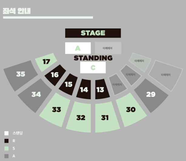 스탠딩석은 구역 내 자유롭게 자리를 잡을 수 있는 반면, 지정좌석은 R/S/A석으로 구분되어 있어요. 스탠딩석 예매 시 받게 되는 번호는 입장 순서를 뜻하니, 빠른 번호를 받고 싶으시다면 예매 시작과 동시에 접속하시는 걸 추천드려요!