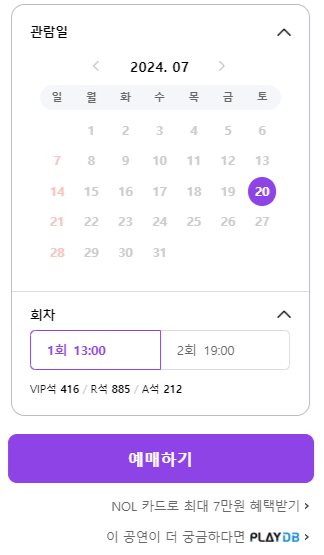 공연 시간은 오후 1시와 7시 두 차례에 걸쳐 진행되며, 티켓 예매는 공연 전날 17시까지 가능합니다. 일요일 공연의 경우에는 전날 11시까지 예매할 수 있으니 이 점 유의하시기 바랍니다.