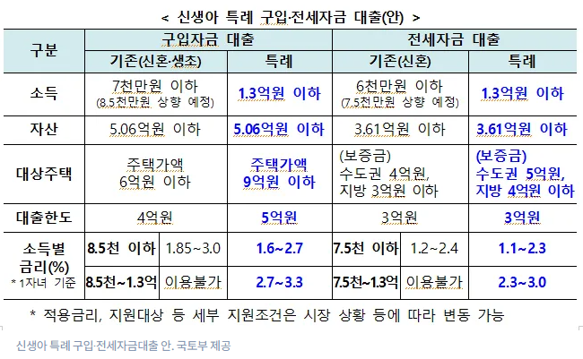 신생아 출산 가구(출산 2년 내)에 대해 디딤돌·버팀목 대출 소득 요건을 연 7000만원에서 1억3000만원으로 완화합니다. ‘맞벌이 페널티’를 없애는 것입니다.
