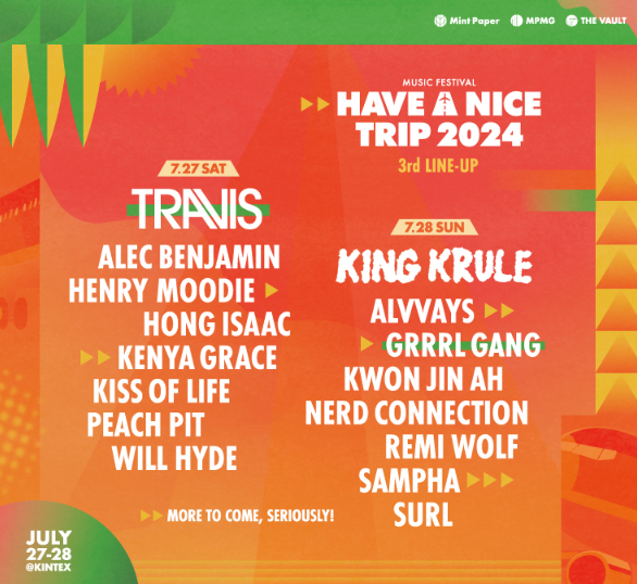 HAVE A NICE TRIP 2024의 3차 라인업이 드디어 공개되었습니다! 올해는 더 많은 해외 아티스트들이 참여하여 더욱 다채로운 무대를 준비하고 있습니다. 7월 27일과 28일, 킨텍스에서 열리는 이번 페스티벌의 자세한 내용을 지금 바로 확인해보세요.