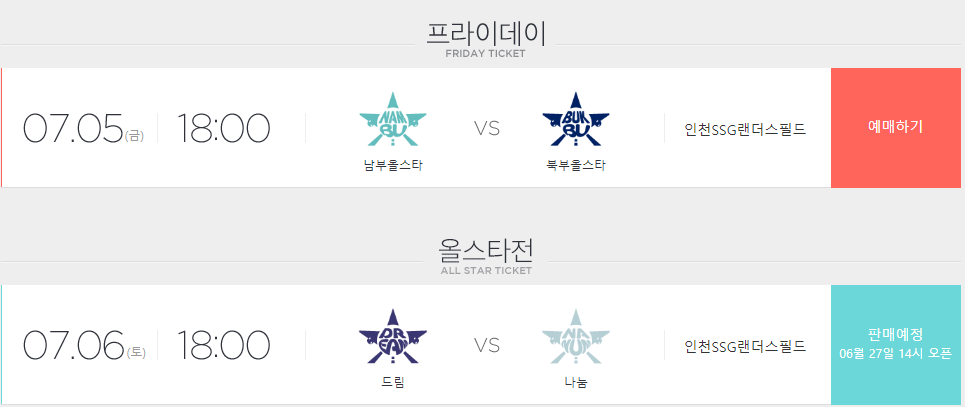 | 6월 27일 (목) 14:00 ~ | KBO 올스타 프라이데이 · 올스타전 일반 예매 |