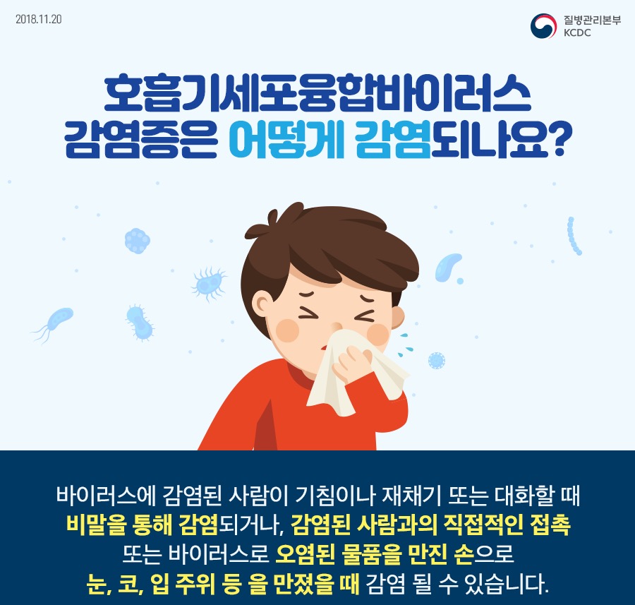 RSV 바이러스는 전염성이 매우 강한 바이러스입니다. 이 바이러스는 감염된 사람이 기침이나 재채기를 할 때 비말을 통해 감염되거나, 감염된 사람과의 직접적인 접촉이나 바이러스로 오염된 물건을 만진 손으로 눈, 코, 입 주위를 만졌을 때 감염될 수 있습니다.