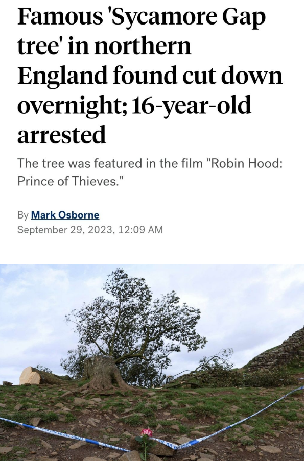 Sycamore Gap Tree는 영국의 문화적 상징이자 세계문화유산으로서 많은 사람들의 사랑과 존경을 받았습니다. 하지만 2023년 9월 28일, 충격적인 일이 발생했습니다. Sycamore Gap Tree가 누군가에 의해 절단되어 쓰러졌다는 소식이 전해졌습니다. 이 사건은 공식적으로 파괴 행위로 간주되었으며, 경찰이 조사에 착수했습니다. 다행히도, 경찰은 범인으로 의심되는 16세 소년을 체포했습니다.